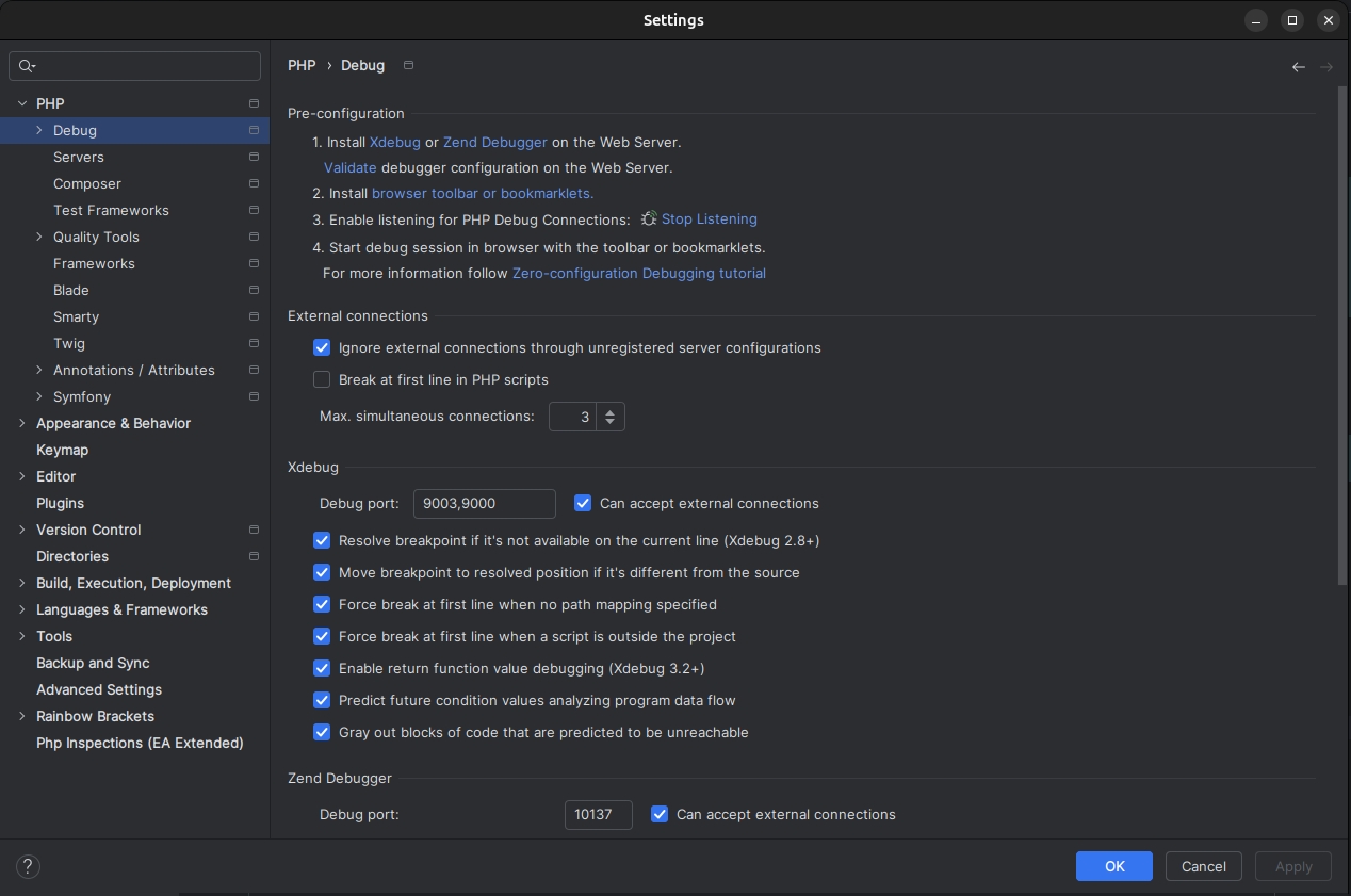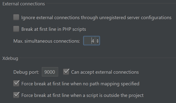Next, change the settings in your IDE so it can accept remote connections. For example, in PhpStorm go to PHP > Debug