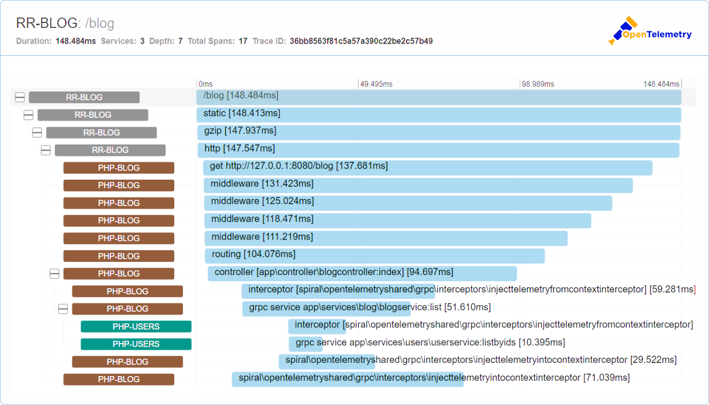 Thanks to Brett McBride, he created a rr-otel PHP demo.